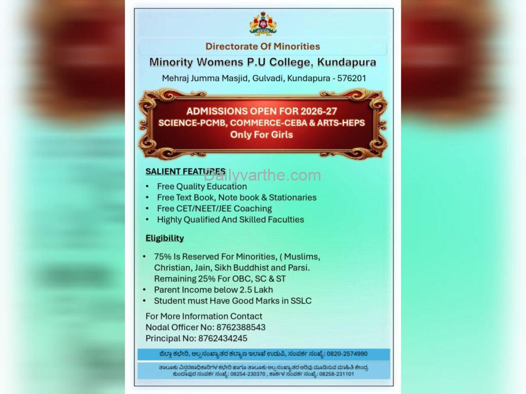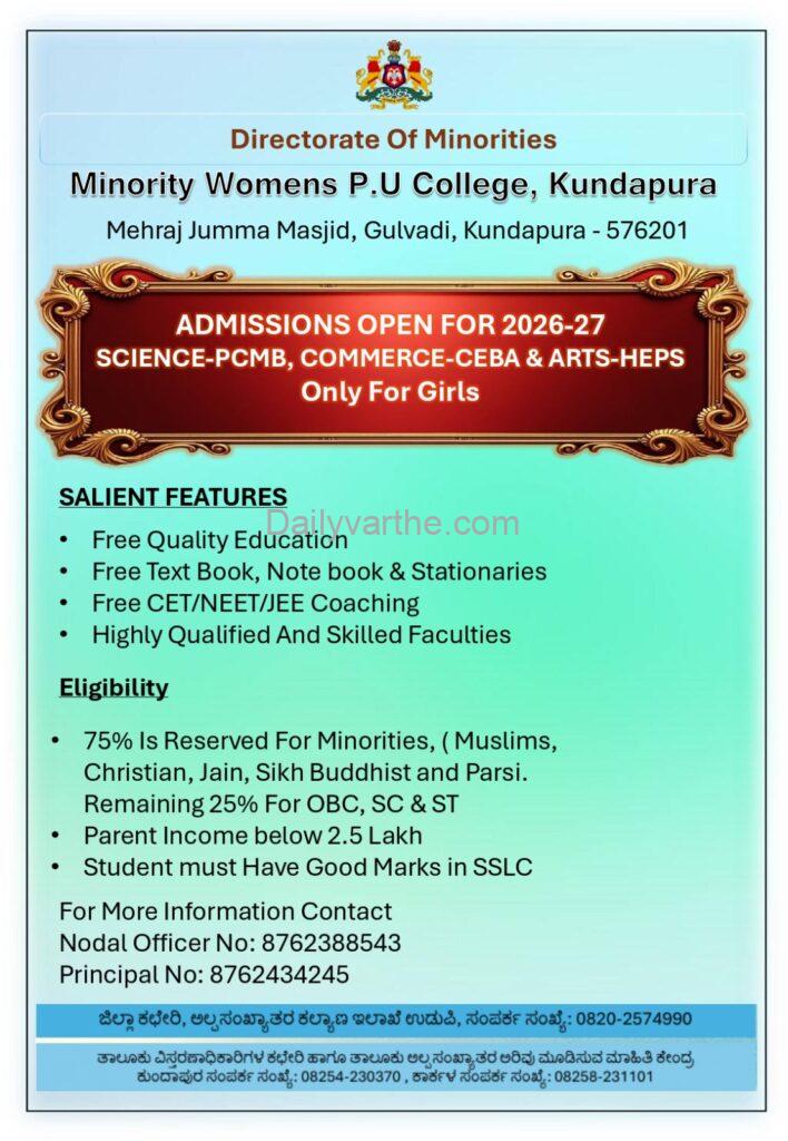ಕುಂದಾಪುರ: ಕರ್ನಾಟಕ ಸರ್ಕಾರದ ಅಲ್ಪಸಂಖ್ಯಾತರ ನಿರ್ದೇಶನಾಲಯದ ಆಶ್ರಯದಲ್ಲಿ ಮೆಹ್ರಾಜ್ ಜುಮ್ಮಾ ಮಸ್ಜಿದ್ ಗುಲ್ವಾಡಿ ಇದರ ಅಡಿಯಲ್ಲಿ ಅಲ್ಪಸಂಖ್ಯಾತರ ಮಹಿಳಾ ಪದವಿ ಪೂರ್ವ ಕಾಲೇಜು ಕುಂದಾಪುರದಲ್ಲಿ 2026-27ನೇ ಸಾಲಿನ ಪ್ರವೇಶ ಪ್ರಕ್ರಿಯೆ ಆರಂಭವಾಗಿದೆ. ಈ ಕಾಲೇಜು ವಿಶೇಷವಾಗಿ ಬಾಲಕಿಯರಿಗಾಗಿ ಕಾರ್ಯನಿರ್ವಹಿಸುತ್ತಿದ್ದು, ವಿಜ್ಞಾನ, ವಾಣಿಜ್ಯ ಮತ್ತು ಕಲಾ ವಿಭಾಗಗಳಲ್ಲಿ ಶಿಕ್ಷಣ ನೀಡಲಾಗುತ್ತಿದೆ.