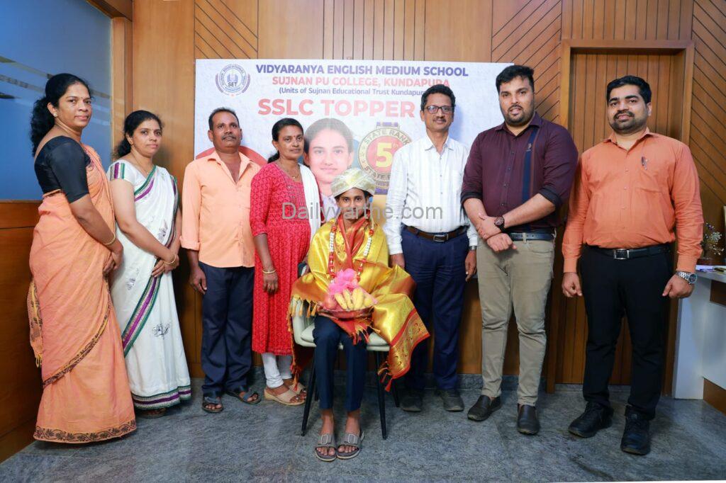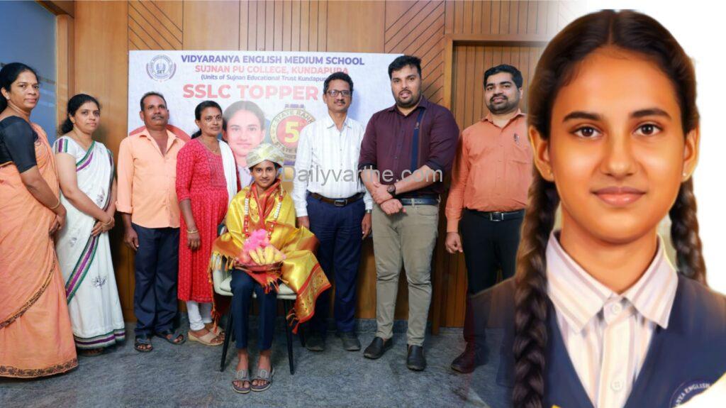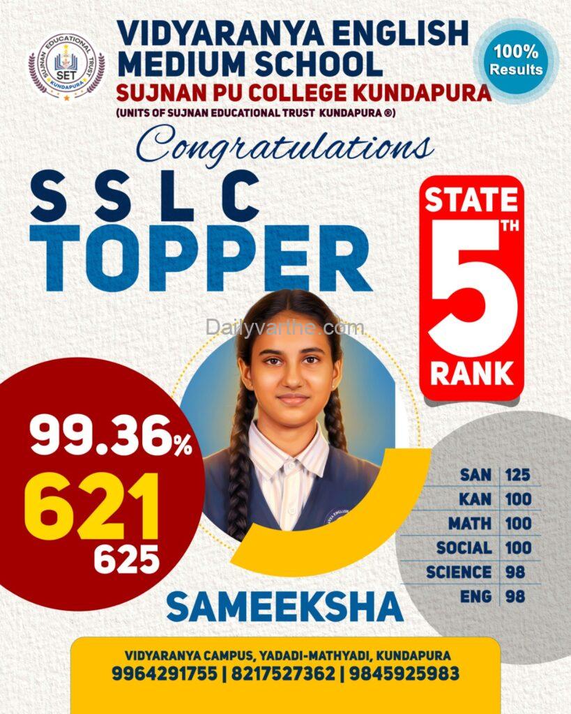 ಕುಂದಾಪುರ: ಕರ್ನಾಟಕ ಶಾಲಾ ಪರೀಕ್ಷೆ ಮತ್ತು ಮೌಲ್ಯನಿರ್ಣಯ ಮಂಡಳಿಯು ಪ್ರಕಟಿಸಿದ 2025-26ನೇ ಸಾಲಿನ ಎಸ್ಎಸ್ಎಲ್ಸಿ ಫಲಿತಾಂಶದಲ್ಲಿ ಕುಂದಾಪುರದ ಯಡಾಡಿ-ಮತ್ಯಾಡಿಯ ಸುಜ್ಞಾನ ಎಜುಕೇಶನಲ್ ಟ್ರಸ್ಟ್ನ ವಿದ್ಯಾರಣ್ಯ ಆಂಗ್ಲ ಮಾಧ್ಯಮ ಶಾಲೆಯ ವಿದ್ಯಾರ್ಥಿನಿ ಸಮೀಕ್ಷಾ ರಾಜ್ಯಮಟ್ಟದಲ್ಲಿ 5ನೇ ರ್ಯಾಂಕ್ ಪಡೆಯುವ ಮೂಲಕ ಜಿಲ್ಲೆ ಮತ್ತು ತಾಲೂಕಿಗೆ ಹೆಮ್ಮೆ ತಂದಿದ್ದಾಳೆ.