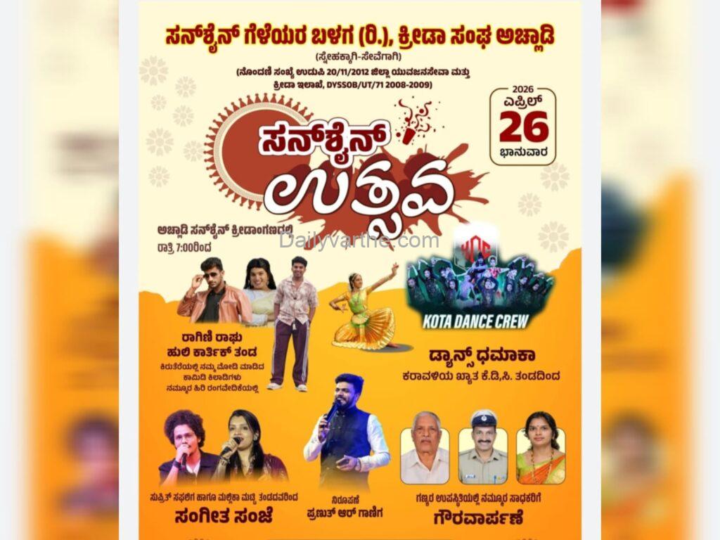 ಕೋಟ, ಎ.25: ಸನ್ ಶೈನ್ ಗೆಳೆಯರ ಬಳಗ ರಿ. ಅಚ್ಲಾಡಿ ಇದರ ವಾರ್ಷಿಕೋತ್ಸವ ಕಾರ್ಯಕ್ರಮ ಎ.26 ರಂದು ಸಂಜೆ 7ಗಂಟೆಗೆ ಅಚ್ಲಾಡಿ ಸನ್ ಶೈನ್ ಕ್ರೀಡಾಂಗಣದಲ್ಲಿ ಜರಗಲಿದ್ದು ಕಾಮಿಡಿ ಕಿಲಾಡಿಗಳು, ಗಿಚ್ಚಿಗಿಲಿಗಿಲಿ ತಂಡದ ಭಾಗವಹಿಸಲಿದೆ.