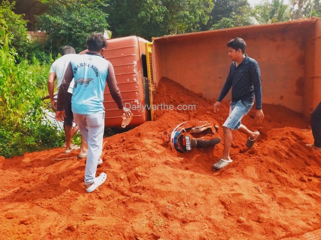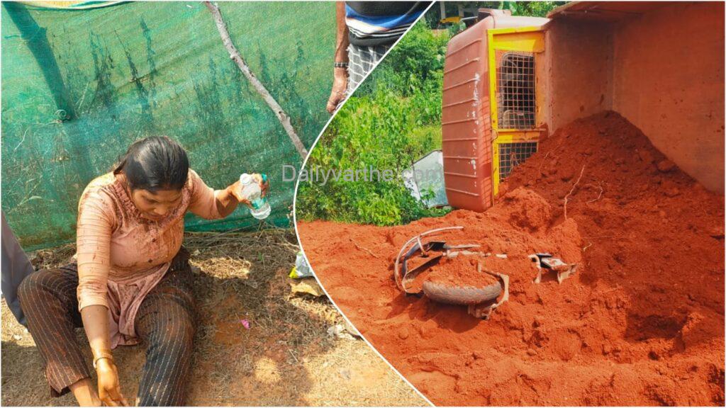 ಮಣ್ಣು ತುಂಬಿದ ಲಾರಿಯೊಂದು ಚಾಲಕನ ನಿಯಂತ್ರಣ ತಪ್ಪಿ ರಸ್ತೆಯ ಪಕ್ಕದಲ್ಲಿ ಹೋಗುತ್ತಿದ್ದ ಸ್ಕೂಟರ್ ಡಿಕ್ಕಿ ಹೊಡೆದು ಪಲ್ಟಿಯಾಗಿ ಮಗುಚಿ ಬಿದ್ದಿದೆ. ಲಾರಿಯಲ್ಲಿದ್ದ ಮಣ್ಣು ಸ್ಕೂಟರಲ್ಲಿದ್ದ ಮಹಿಳೆ ಮೇಲೆ ಬಿದ್ದು ಮಣ್ಣಿನ ಅಡಿಯಲ್ಲಿ ಮಹಿಳೆ ಸಿಲುಕಿ ಕೊಂಡಸಂದರ್ಭ .
