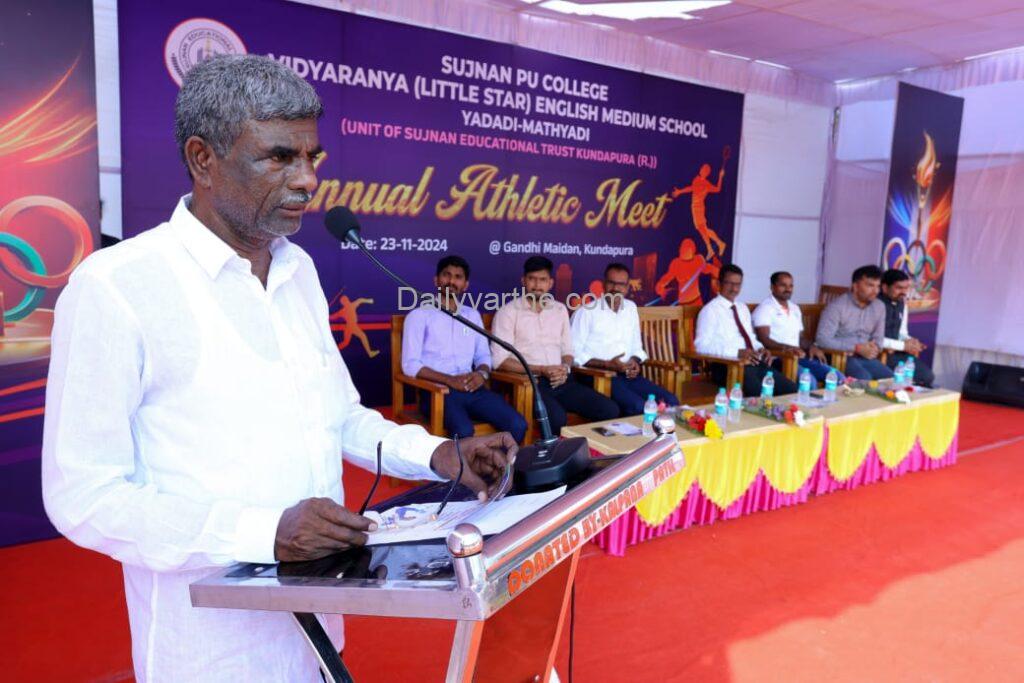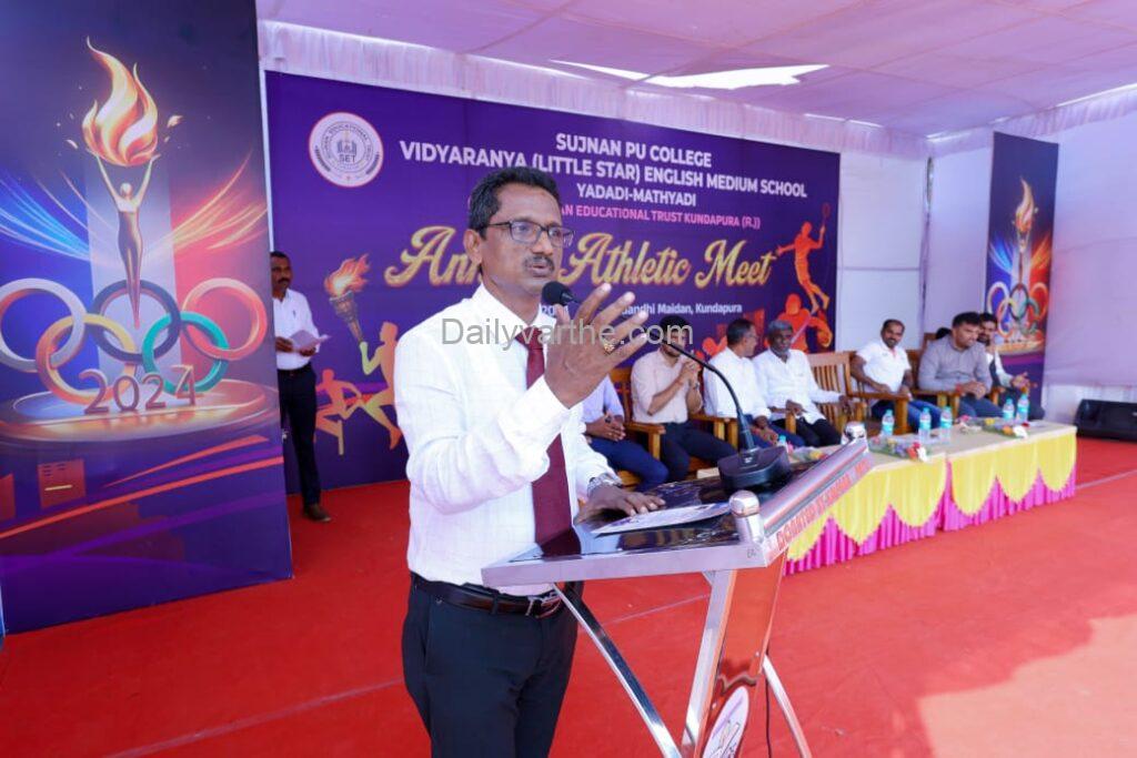 ಕ್ರೀಡಾ ಕೂಟವನ್ನು ಉದ್ಘಾಟಿಸಿ ಮಾತನಾಡಿದ ಉಡುಪಿ ಲೋಕ ಸಭಾ ಕ್ಷೇತ್ರದ ಸಂಸದ ಕೋಟ ಶ್ರೀನಿವಾಸ ಪೂಜಾರಿ ಯವರು” ಸಾಧನೆಯಲ್ಲಿ ಛಲವಿದ್ದವರಿಗೆ ಯಾವುದೂ ಹಿನ್ನಡೆಯಾಗುವುದಿಲ್ಲ. ನಿರ್ದಿಷ್ಟವಾದ ಗುರಿ ಉದ್ದೇಶದಿಂದ ಸ್ಪಷ್ಟವಾದ ದಾರಿಯಲ್ಲಿ ಸಾಗಿದಾಗ ಯಶಸ್ಸು ಖಂಡಿತ ಸಿಗುತ್ತದೆ. ಕ್ರೀಡಾ ಕ್ಷೇತ್ರದಲ್ಲಿ ಸೋಲು ಮತ್ತು ಗೆಲುವು ಸಾಮಾನ್ಯ. ಅವೆರಡನ್ನೂ ಸಮಾನವಾಗಿ ಸ್ವೀಕರಿಸಿ ನಿರಂತರ ಪ್ರಯತ್ನ ಮಾಡಬೇಕು. ಕ್ರೀಡಾ ಕ್ಷೇತ್ರದಲ್ಲಿ ಅಸಕ್ತಿಯುಳ್ಳ ಮಕ್ಕಳಿಗೆ ಹಿಮಾಲಯ ಪರ್ವತ ಏರಿದ ತೇನ್ ಸಿಂಗ್ ಮಾದರಿಯಾಗಬೇಕು. ಗ್ರಾಮೀಣ ಪ್ರದೇಶದ ಮಕ್ಕಳು ಕೂಡ ಕ್ರೀಡಾ ವಿಭಾಗದಲ್ಲಿ ಹೆಚ್ಚಿನ ಸಾಧನೆ ಮಾಡುವಂತಾಗಬೇಕು. ಡಾ.ರಮೇಶ್ ಶೆಟ್ಟಿ ಯವರ ಸಮರ್ಥವಾದ ನೇತೃತ್ವದಲ್ಲಿ ವಿದ್ಯಾರಣ್ಯ ಆಂಗ್ಲ ಮಾಧ್ಯಮ ಶಾಲೆ ಮತ್ತು ಸುಜ್ಞಾನ ಪದವಿ ಪೂರ್ವ ಕಾಲೇಜು ಪಠ್ಯ ಮತ್ತು ಪಠ್ಯೇತರ ಚಟುವಟಿಕೆಗಳಲ್ಲಿ ಅತ್ಯುತ್ತಮ ಸಾಧನೆ ಮಾಡುತ್ತಿದ್ದು, ಸಂಸ್ಥೆ ಮುಂದಿನ ದಿನಗಳಲ್ಲಿ ರಾಜ್ಯ ಮಟ್ಟದಲ್ಲಿ ಪ್ರಸಿದ್ಧಿ ಪಡೆಯಲಿ “ಎಂದರು.