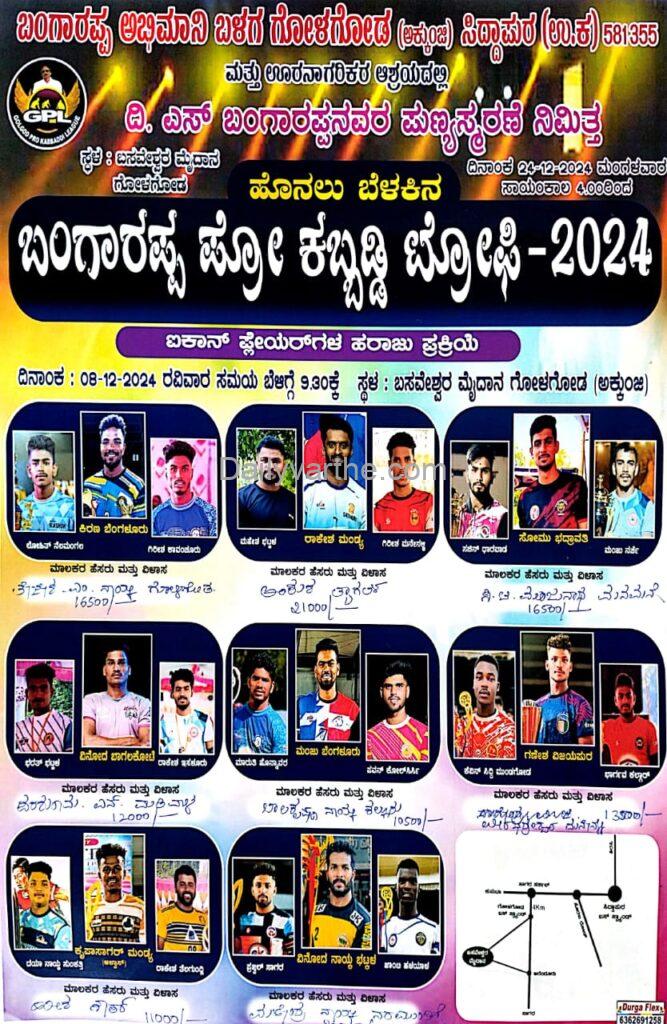 ಸಿದ್ದಾಪುರ (ಉ. ಕ ) ಗೋಳಗೋಡು ಗ್ರಾಮದಲ್ಲಿ ಬಂಗಾರಪ್ಪ ಅಭಿಮಾನಿ ಬಳಗ ಮತ್ತು ಊರ ನಾಗರೀಕ ಆಶ್ರಯದಲ್ಲಿ ಹೊನಲು ಬೆಳಕಿನ “ಬಂಗಾರಪ್ಪ ಪ್ರೋ ಕಬ್ಬಡ್ಡಿ ಟ್ರೋಫಿ – 2024” ಐಕಾನ್ ಆಟಗಾರರ ಹರಾಜು ಪ್ರಕ್ರಿಯೆ