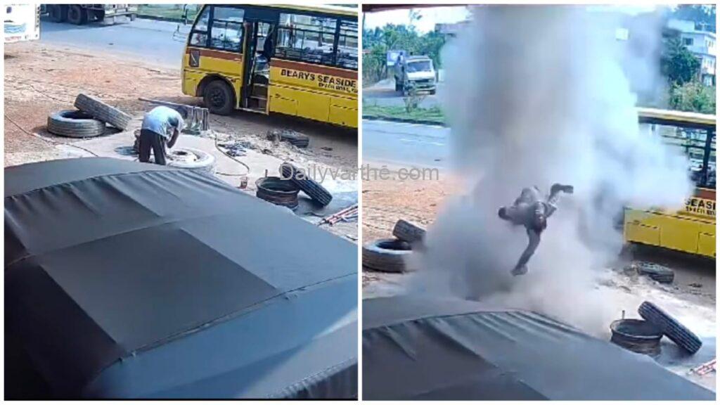 ಟಯರ್ ಸ್ಫೋಟಗೊಳ್ಳುವ ಭಯಾನಕ ದೃಶ್ಯ ಅಂಗಡಿಯ ಸಿಸಿಟಿವಿಯಲ್ಲಿ ಸೆರೆಯಾಗಿದೆ.