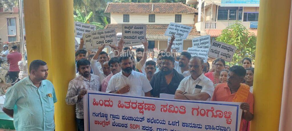 ಪಂಚಾಯತ್ ಕಚೇರಿ ಮುಂದೆ ಪ್ರತಿಭಟನೆ ನಡೆಸಿದ ಹಿಂದೂ ಸಂಘಟನೆ ಕಾರ್ಯಕರ್ತರು ಕಾಂಗ್ರೆಸ್ ಮತ್ತು ಎಸ್ ಡಿಪಿಐ ನಡೆಯನ್ನು ಖಂಡಿಸಿದರು.