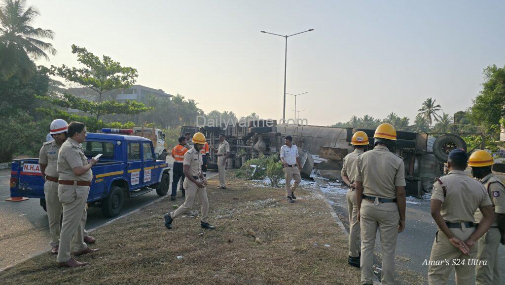 ಕೆಲಕಾಲ ಹೆದ್ದಾರಿ ಸಂಚಾರದಲ್ಲಿ ವ್ಯತ್ಯಯ ಉಂಟಾಯಿತು. ಕೂಡಲೇ ಸ್ಥಳಕ್ಕೆ ಆಗಮಿಸಿದ ಅಗ್ನಿಶಾಮಕ ಇಲಾಖೆಯ ಸಿಬ್ಬಂದಿ ಕಾರ್ಯಾಚರಣೆ ಮೂಲಕ ಟ್ಯಾಂಕರ್ ಅನ್ನು ತೆರವುಗೊಳಿಸುವ ಕಾರ್ಯದಲ್ಲಿ ನಿರತರಾಗಿದ್ದಾರೆ. ಅಗ್ನಿಶಾಮಕ ಇಲಾಖೆ ಸಿಬ್ಬಂದಿ ಕ್ಷಿಪ್ರ ಕಾರ್ಯಾಚರಣೆಯಿಂದ ಭಾರೀ ಅನಾಹುತವೊಂದು ತಪ್ಪಿದಂತಾಗಿದೆ.
