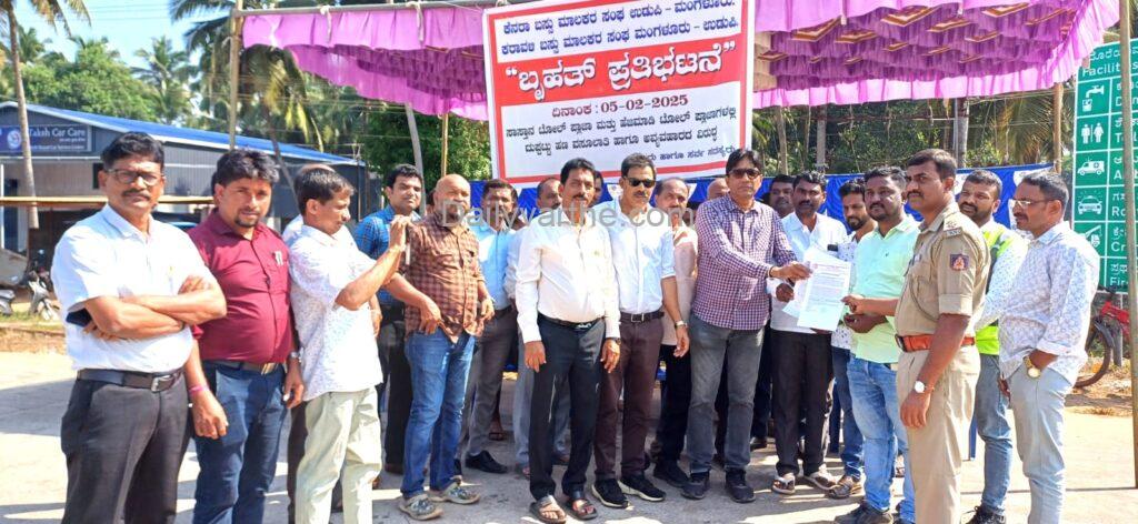 ಸಾಸ್ತಾನ ಟೋಲ್ ಪ್ಲಾಜಾ ಬಳಿ ಬಸ್ಸು ಮಾಲಕರ ಸಂಘಟನೆಯಿಂದ ಪ್ರತಿಭಟನೆ