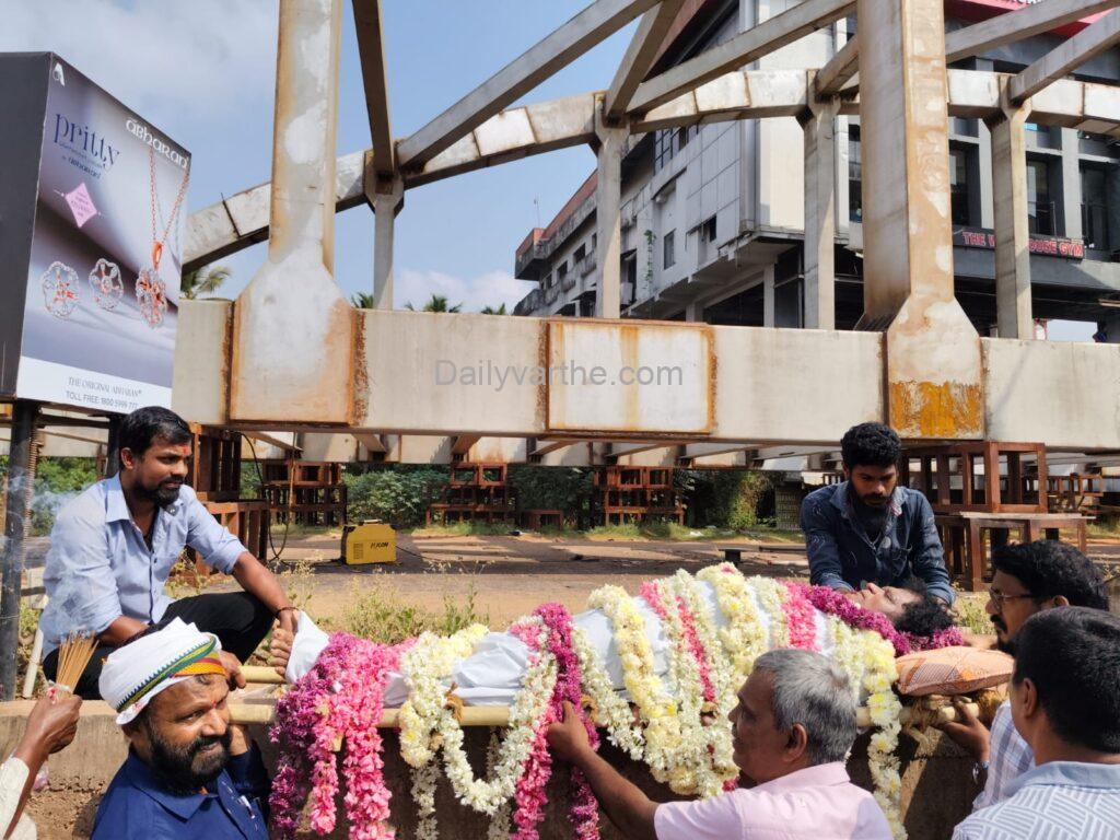 ನಿತ್ಯಾನಂದ ಒಳಕಾಡು ತಾನೇ ಶವದಂತೆ ಚಟ್ಟದ ಮೇಲೆ ಮಲಗಿದರೆ, ನಾಗರಿಕ ಸಮಿತಿಯ ಕಾರ್ಯಕರ್ತರು ಶವಯಾತ್ರೆ ನಡೆಸಿದರು.
