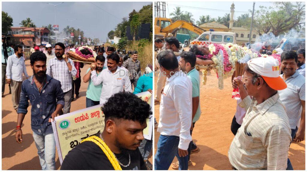 ಉಡುಪಿ |ಉಡುಪಿಯ ಇಂದ್ರಾಳಿ ರೈಲ್ವೆ ಮೇಲ್ಸೇತುವೆ ಕಾಮಗಾರಿ ವಿಳಂಬ – ‘ಜೀವಂತ ಶವ ಯಾತ್ರೆ’ ನಡೆಸಿ ಆಕ್ರೋಶ ಹೊರಹಾಕಿದ ನಾಗರಿಕರು!