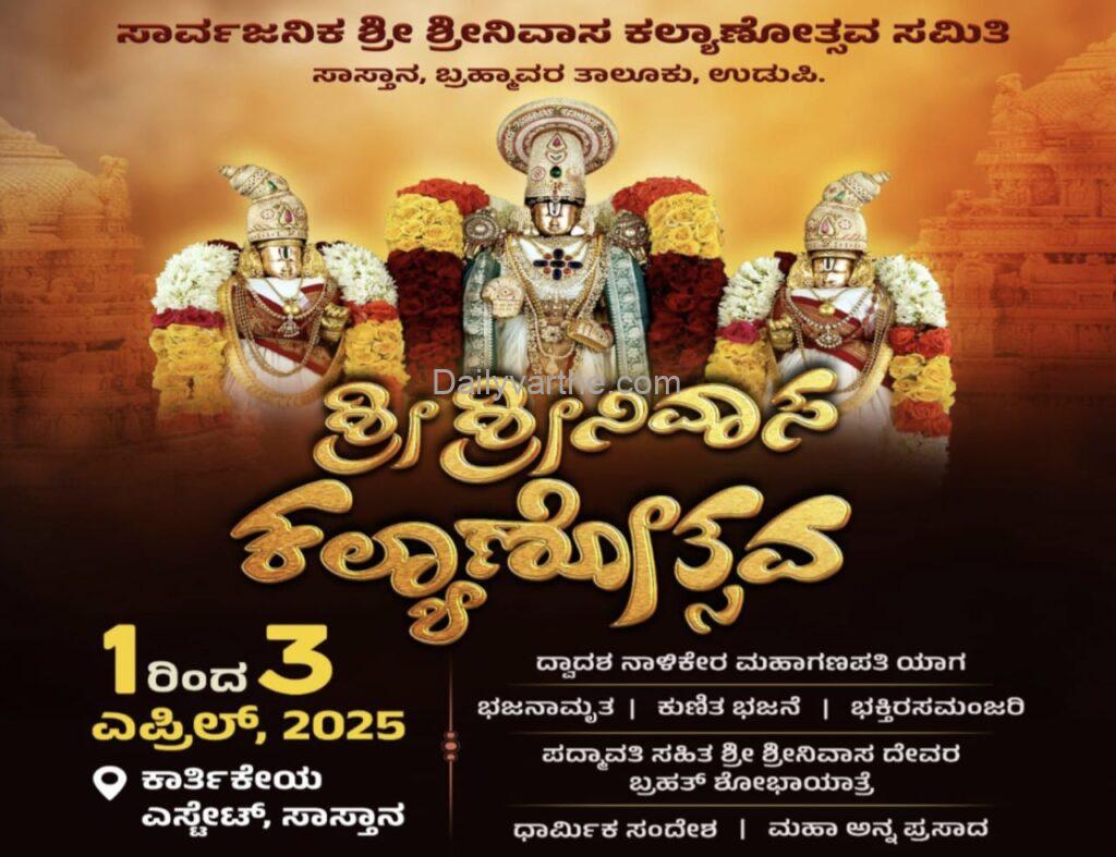ಕೋಟ: ಎಪ್ರಿಲ1ರಿಂದ 3ರ ತನಕ ಸಾಸ್ತಾನದ ಕಾರ್ತಿಕೇಯ ಎಸ್ಟೇಟ್ ಇಲ್ಲಿ ಲೋಕ ಕಲ್ಯಾಣಾರ್ಥವಾಗಿ ಸಾರ್ವಜನಿಕ ಶ್ರೀನಿವಾಸ ಕಲ್ಯಾಣೋತ್ಸವ ಕಾರ್ಯಕ್ರಮ ಇತಿಹಾಸದಲ್ಲೆ ಮೊದಲೆಂಬಂತೆ ಸಾಸ್ತಾನದಲ್ಲಿ ನಡೆಯಲಿದೆ.