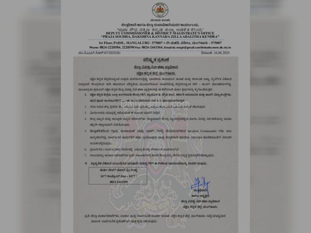 ಮಳೆ ಬಿರುಸು ಹಿನ್ನಲೆ : ದ.ಕ. ಜಿಲ್ಲೆಯ ಅಂಗನವಾಡಿಯಿಂದ ಪಿಯು ತರಗತಿವರೆಗೆ ಜೂನ್ 16 ಸೋಮವಾರ (ಇಂದು) ರಜೆ ಘೋಷಿಸಿ ಡಿಸಿ ಪರಿಷ್ಕೃತ ಆದೇಶ