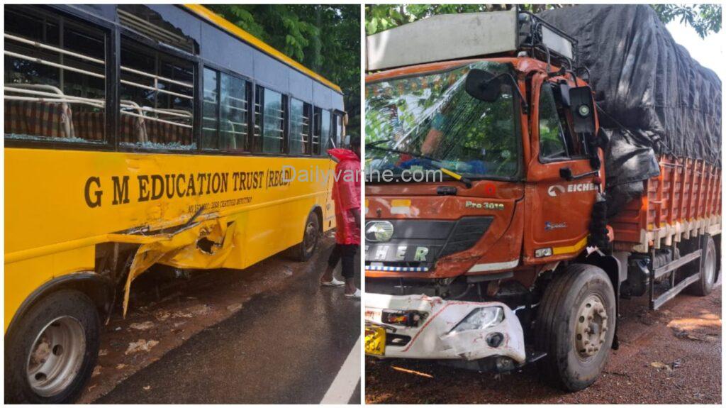 G. M. ವಿದ್ಯಾನಿಕೇತನ ಆಂಗ್ಲಮಾಧ್ಯಮ ಶಾಲಾ ವಿದ್ಯಾರ್ಥಿಗಳಿದ್ದ ಶಾಲಾ ಬಸ್ ಕುಂದಾಪುರದಿಂದ ಬಂದು ಧರ್ಮವರ ಆಡಿಟೋರಿಯಂ ಸರ್ಕಲ್ ಬಳಿ ಯೂ ಟರ್ನ್ ಮಾಡುವ ಸಂದರ್ಭ ಹಿಂದಿನಿಂದ ಬಂದ ಈಚಾರ್ ಲಾರಿಯೊಂದು ಡಿಕ್ಕಿ ಹೊಡೆದಿದೆ.