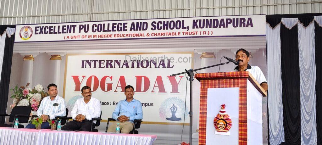 ಅವರು ಜೂ. 21 ರಂದು ಶನಿವಾರ ಬೆಳಿಗ್ಗೆ ಕುಂದಾಪುರ ಎಕ್ಸಲೆಂಟ್ ಪಿಯು ಕಾಲೇಜ್ ಸುಣ್ಣಾರಿಯಲ್ಲಿ ನಡೆದ ವಿಶ್ವ ಯೋಗ ದಿನಾಚರಣೆಯ ಯೋಗಾಸನ ವನ್ನು ಉದ್ಘಾಟಿಸಿ ಮಾತನಾಡಿದರು.