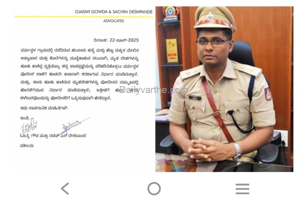 ಧರ್ಮಸ್ಥಳದಲ್ಲಿ ನಡೆದಿರುವ ಹಲವು ಅತ್ಯಾಚಾರ, ಕೊಲೆ ಪ್ರಕರಣದ ಬಗ್ಗೆ ಪೊಲೀಸ್ ಠಾಣೆಗೆ ಮಾಹಿತಿ ನೀಡುತ್ತೇನೆಂದ ಪತ್ರ ವೈರಲ್: ವ್ಯಕ್ತಿಗೆ ರಕ್ಷಣೆ ನೀಡಲು ಬದ್ಧ ಎಂದ ದ.ಕ. ಎಸ್ಪಿ
