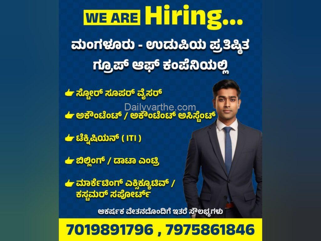 ಮಂಗಳೂರು ಮತ್ತು ಉಡುಪಿಯ ಪ್ರತಿಷ್ಠಿತ ಗ್ರೂಪ್ ಆಫ್ ಕಂಪೆನಿಯಲ್ಲಿ ಉದ್ಯೋಗವಕಾಶ!