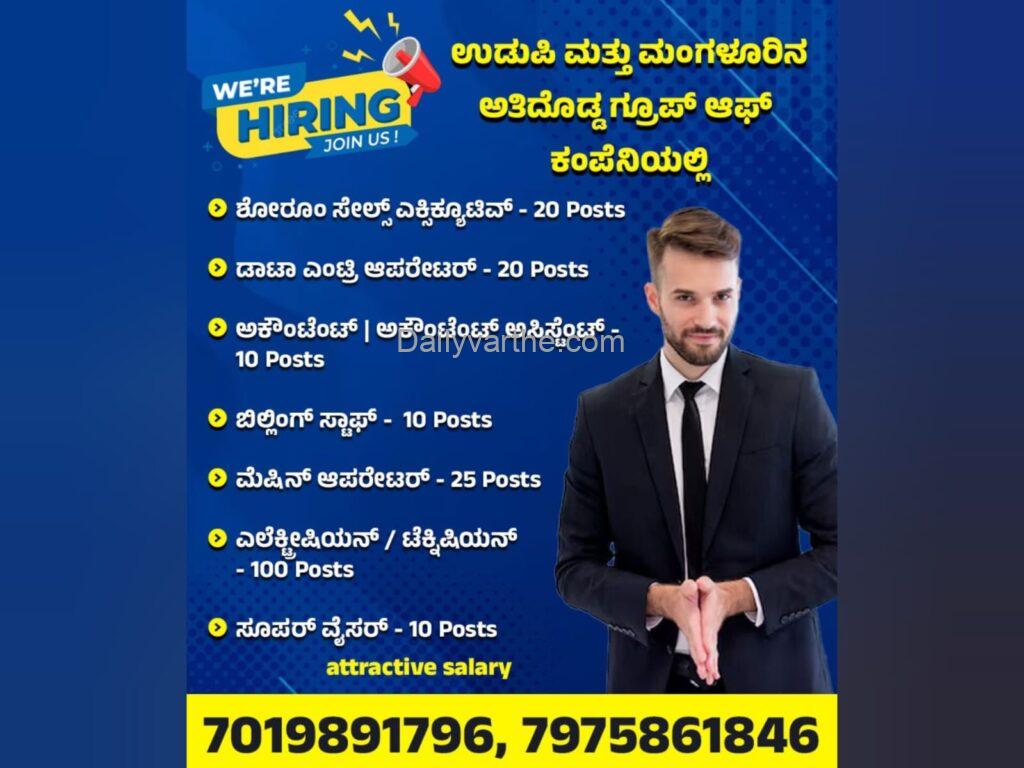 ಉಡುಪಿ ಮತ್ತು ಮಂಗಳೂರು ಅತೀ ದೊಡ್ಡ ಗ್ರೂಪ್ ಆಫ್ ಕಂಪೆನಿಯಲ್ಲಿ ಬೇಕಾಗಿದ್ದಾರೆ.