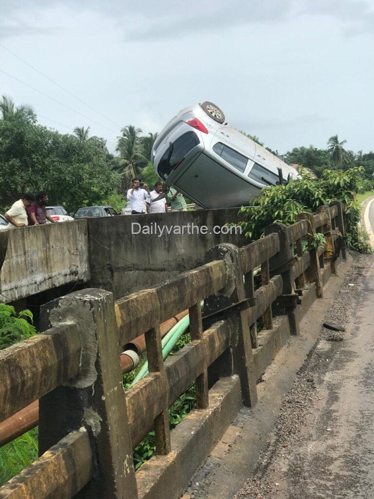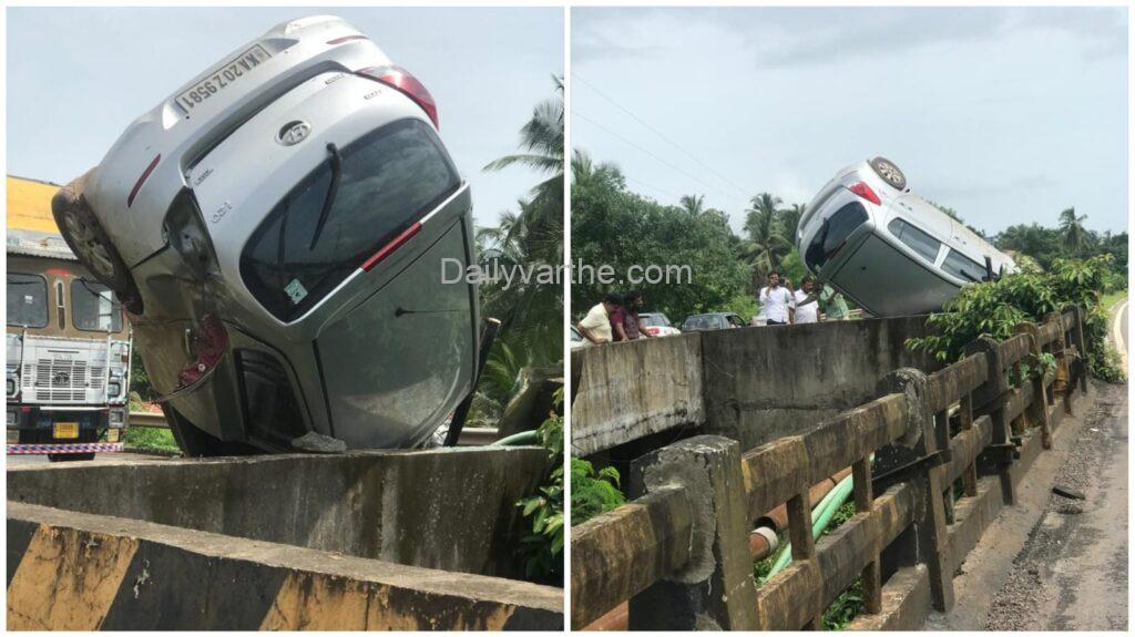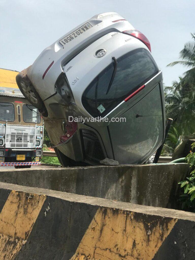 ಉದ್ಯಾವರ| ಚಾಲಕನ ನಿಯಂತ್ರಣ ತಪ್ಪಿ ಸೇತುವೆ ಮೇಲೆ ಮಗುಚಿ ಬಿದ್ದ ಕಾರು – ಕೂದಲೆಳೆ ಅಂತರದಲ್ಲಿ ಪಾರಾದ ಪ್ರಯಾಣಿಕರು!