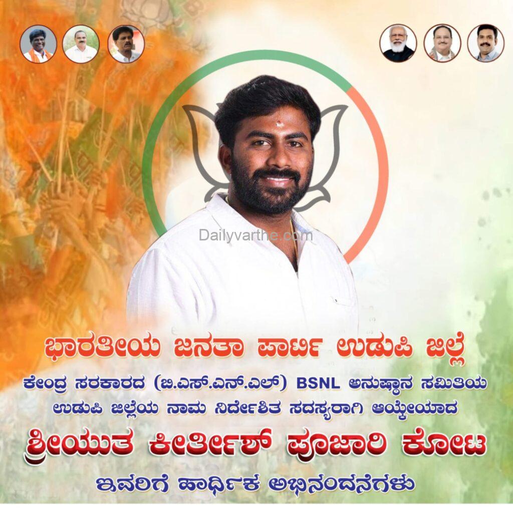 BSNL ಅನುಷ್ಠಾನ ಸಮಿತಿಯ ಉಡುಪಿ ಜಿಲ್ಲೆಯ ನಾಮ ನಿರ್ದೇಶಿತ ಸದಸ್ಯರಾಗಿ ಕೀರ್ತೀಶ್ ಪೂಜಾರಿ ಕೋಟ ಆಯ್ಕೆ