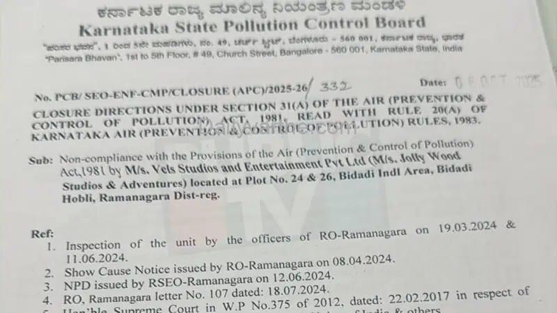 ಕರ್ನಾಟಕ ಮಾಲಿನ್ಯ ನಿಯಂತ್ರಣ ಕಾಯ್ದೆ 1981ರ ಸೆಕ್ಷನ್ 31, ಕಾಯ್ದೆ 1983 ನಿಯಮ 20(ಎ) ಅನ್ವಯ ತಕ್ಷಣದಿಂದಲೇ ಸ್ಟುಡಿಯೋ ಬಂದ್ ಮಾಡಲು ಆದೇಶ ಹೊರಡಿಸಿದ್ದು, ಕೂಡಲೇ ಜಾಲಿವುಡ್ ಸ್ಟುಡಿಯೋಸ್ & ಅಡ್ವೆಂಚರ್ಸ್ ಪಾರ್ಕ್ ಬಂದ್ ಮಾಡಸಿ ಕ್ರಮವಹಿಸಲು ರಾಮನಗರ ಜಿಲ್ಲಾಧಿಕಾರಿಗೆ ಸೂಚನೆ ನೀಡಲಾಗಿದೆ.
