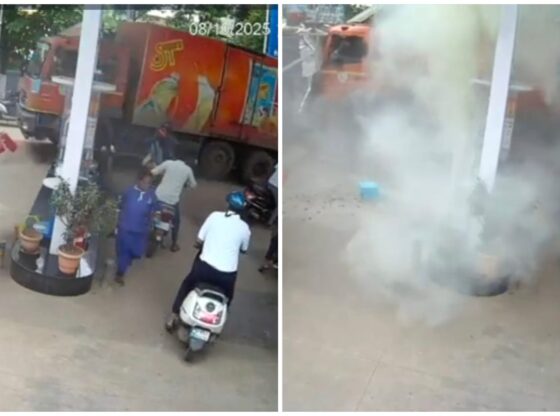 ಏಕಾಏಕಿ ಪೆಟ್ರೋಲ್ ಬಂಕ್ಗೆ ನುಗ್ಗಿದ ಕಂಟೇನರ್ ಲಾರಿ – ತಪ್ಪಿದ ಬಾರೀ ಅನಾಹುತ!