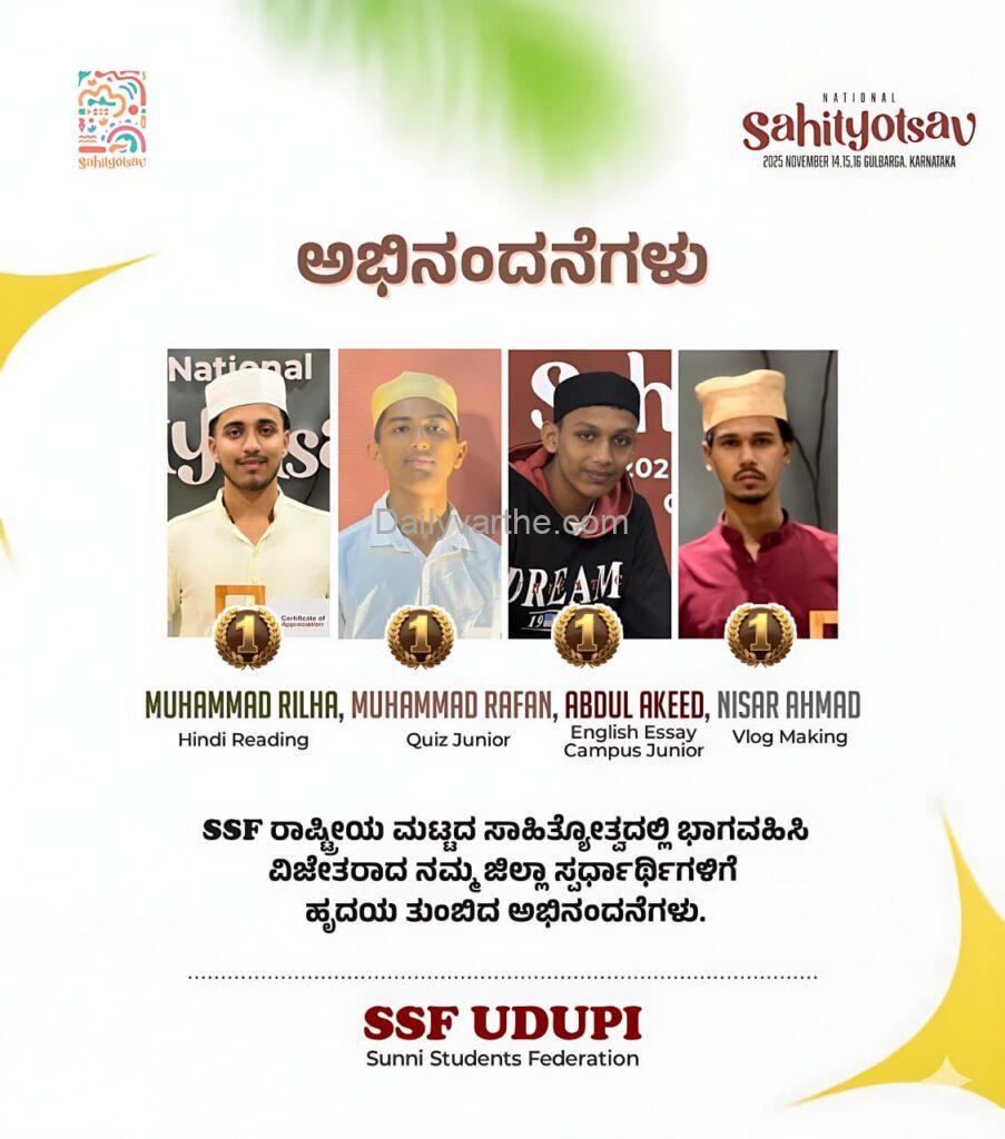SSF ರಾಷ್ಟ್ರಮಟ್ಟದ ಸಾಹಿತ್ಯೋತ್ಸವ ಕರ್ನಾಟಕದ ಹೆಸರಾಂತ ತೊಗರಿನಾಡು ಗುಲ್ಬರ್ಗಾದ ಮಣ್ಣಿನಲ್ಲಿ ನವೆಂಬರ್-14,15 ಮತ್ತು 16 ರಂದು ನಡೆದಾಗ, SSF ಉಡುಪಿ ಜಿಲ್ಲೆಯ ಐದು ಸ್ಪರ್ಧಾರ್ಥಿಗಳು ಭಾಗವಹಿಸಿದ್ದು, ಅದರಲ್ಲಿ ನಾಲ್ಕು ಸ್ಪರ್ಧಾರ್ಥಿಗಳು ಪ್ರಥಮ ಸ್ಥಾನ ಪಡೆದು ರಾಷ್ಟ್ರ ಸಾಹಿತ್ಯೋತ್ಸವದಲ್ಲಿ ವಿಶೇಷ ಸಾಧನೆಗೈದಿದ್ದಾರೆ. ತನ್ಮೂಲಕ ತಾಯ್ನಾಡಿನ ಹಿರಿಮೆಯನ್ನು ಎತ್ತಿ ಹಿಡಿದಿರುವ ಈ ಸ್ಪರ್ಧಾರ್ಥಿಗಳಿಗೆ SSF ಉಡುಪಿ ಜಿಲ್ಲಾ ಸಮಿತಿ ವಿಶೇಷವಾಗಿ ಅಭಿನಂದನೆಗಳನ್ನು ಸಲ್ಲಿಸಿದರು.