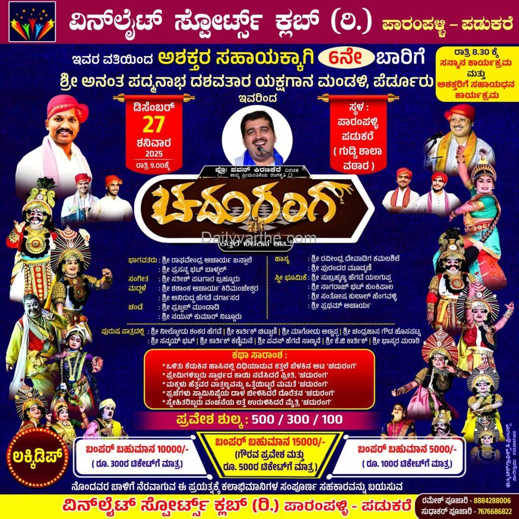 ಪವನಗ ಕಿರಣಕೆರೆ ಇವರ ಪ್ರಸಿದ್ಧ ಯಕ್ಷಗಾನ ಚದುರಂಗ ಅಶಕ್ತ ಅನಾರೋಗ್ಯ ಪೀಡಿತರ ಬಾಳಿನ ನೆರವಿಗಾಗಿ ಪ್ರದರ್ಶನಗೊಳ್ಳಲಿದೆ ಎಂದು ಸಂಘಟಕರು ತಿಳಿಸಿದ್ದಾರೆ.