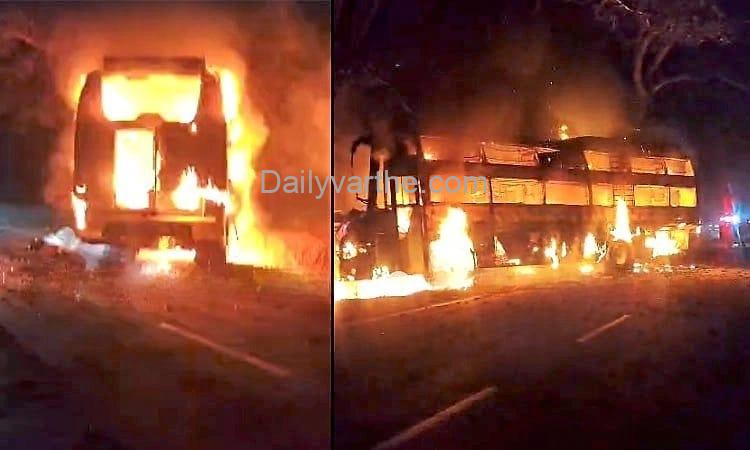 ಶಿವಮೊಗ್ಗದಲ್ಲಿ ಧಗಧಗನೆ ಹೊತ್ತಿ ಉರಿದ ಖಾಸಗಿ ಸ್ಲೀಪರ್ ಬಸ್ – 40 ಪ್ರಯಾಣಿಕರು ಅಪಾಯದಿಂದ ಪಾರು