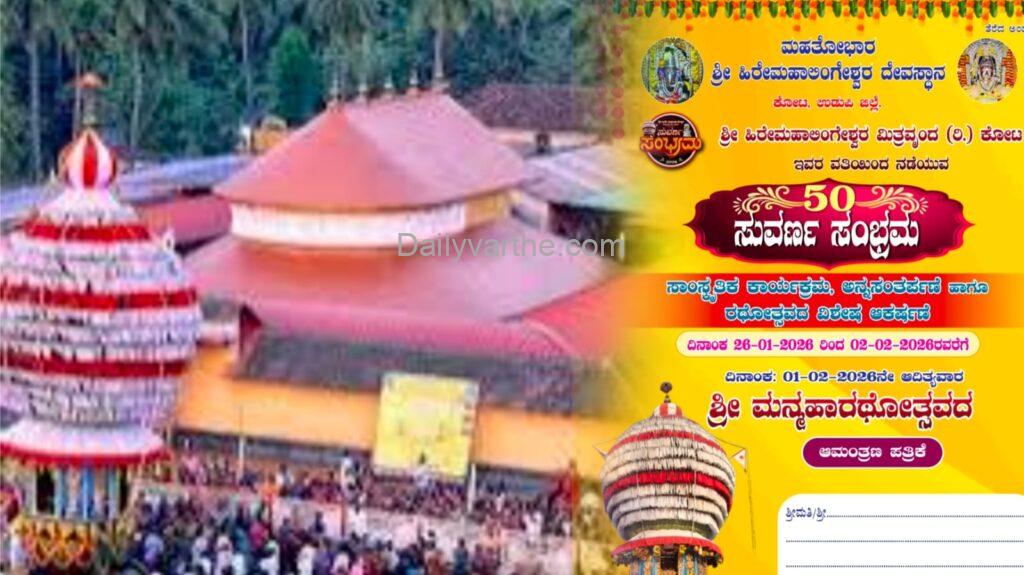ಕೋಟದ ಶ್ರೀ ಹಿರೇಮಹಾಲಿಂಗೇಶ್ವರ ದೇವಸ್ಥಾನದಲ್ಲಿ 50 ಸುವರ್ಣ ಸಂಭ್ರಮ: ಸಾಂಸ್ಕೃತಿಕ ವೈಭವ, ರಥೋತ್ಸವ ಮತ್ತು ಅನ್ನಸಂತರ್ಪಣೆ
