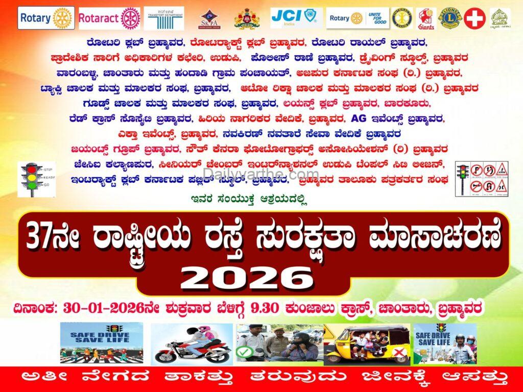 ಜ.30 ರಂದು ಬ್ರಹ್ಮಾವರದಲ್ಲಿ 37ನೇ ರಾಷ್ಟ್ರೀಯ ರಸ್ತೆ ಸುರಕ್ಷತಾ ಮಾಸಾಚರಣೆ: ಜಾಗೃತಿ ಮೆರವಣಿಗೆ ಹಾಗೂ ಸಾರ್ವಜನಿಕರಿಗೆ ರಸ್ತೆ ಸುರಕ್ಷತಾ ಸಂದೇಶ