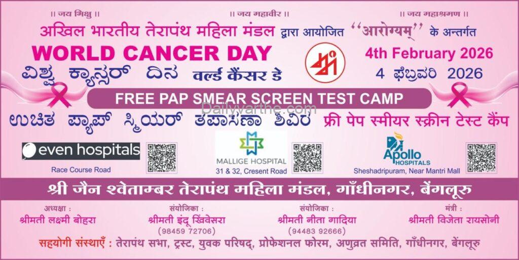 ಬೆಂಗಳೂರು, ಫೆ. 02 :ವಿಶ್ವ ಕ್ಯಾನ್ಸರ್ ದಿನದ ಹಿನ್ನೆಲೆಯಲ್ಲಿ ಅಖಿಲ ಭಾರತ ಥೇರಾ ಪಂಥ ಮಹಿಳಾ ಮಂಡಳದ ಆಶ್ರಯದಲ್ಲಿ ಬೆಂಗಳೂರಿನ ಗಾಂಧಿನಗರ ಶಾಖೆಯ ವತಿಯಿಂದ ಉಚಿತ ಸರ್ವೈಕಲ್ ಕ್ಯಾನ್ಸರ್ ತಪಾಸಣೆ ಹಾಗೂ ಚಿಕಿತ್ಸಾ ಅಭಿಯಾನವನ್ನು ಫೆ.4ರಂದು ಹಮ್ಮಿಕೊಳ್ಳಲಾಗಿದೆ ಎಂದು ಮಂಡಳದ ಪ್ರತಿನಿಧಿ ಲಕ್ಷ್ಮೀ ಬೋಹ್ರಾ ತಿಳಿಸಿದ್ದಾರೆ.