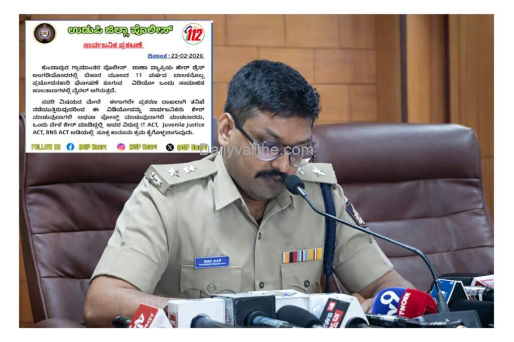 ಅಪ್ರಾಪ್ತ ಬಾಲಕನ ಪ್ರಚೋದನಕಾರಿ ಘೋಷಣೆ ವಿಡಿಯೋ ಶೇರ್ ಮಾಡಿದರೆ ಕಾನೂನು ಕ್ರಮ: ಉಡುಪಿ ಜಿಲ್ಲಾ ಪೊಲೀಸರ ಕಠಿಣ ಎಚ್ಚರಿಕೆ