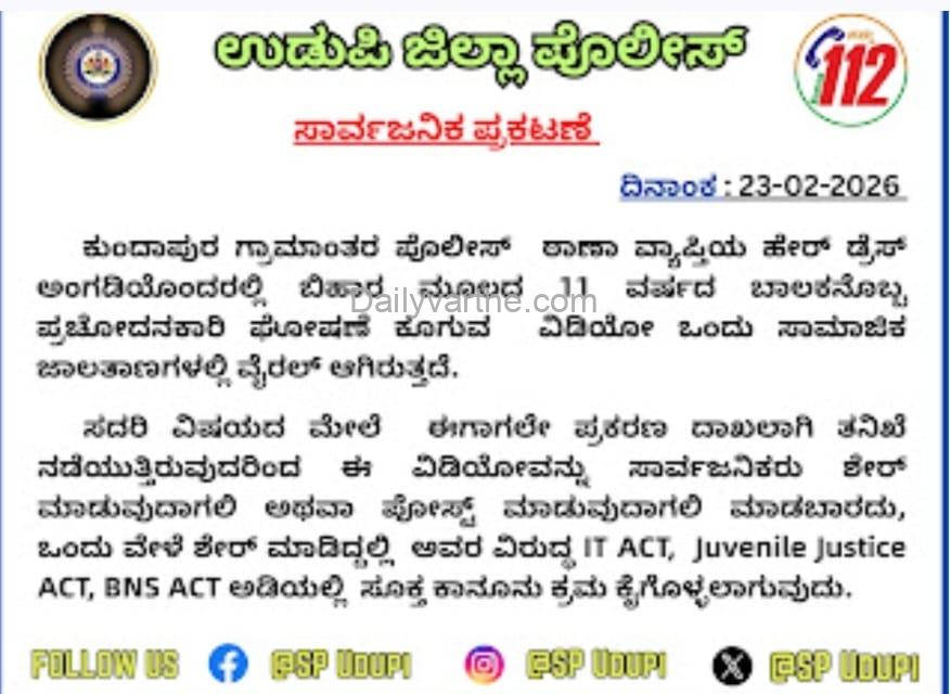 ಉಡುಪಿ: ಕುಂದಾಪುರ ಗ್ರಾಮಾಂತರ ಪೊಲೀಸ್ ಠಾಣಾ ವ್ಯಾಪ್ತಿಯ ಹೇರ್ ಡ್ರೆಸ್ ಅಂಗಡಿಯೊಂದರಲ್ಲಿ ಬಿಹಾರ ಮೂಲದ 11 ವರ್ಷದ ಬಾಲಕನೊಬ್ಬ ಪ್ರಚೋದನಕಾರಿ ಘೋಷಣೆ ಕೂಗುತ್ತಿರುವ ವಿಡಿಯೋ ಸಾಮಾಜಿಕ ಜಾಲತಾಣಗಳಲ್ಲಿ ವೈರಲ್ ಆಗಿರುವ ಹಿನ್ನೆಲೆಯಲ್ಲಿ ಉಡುಪಿ ಜಿಲ್ಲಾ ಪೊಲೀಸರು ಸಾರ್ವಜನಿಕರಿಗೆ ಮಹತ್ವದ ಸೂಚನೆ ನೀಡಿದ್ದಾರೆ.