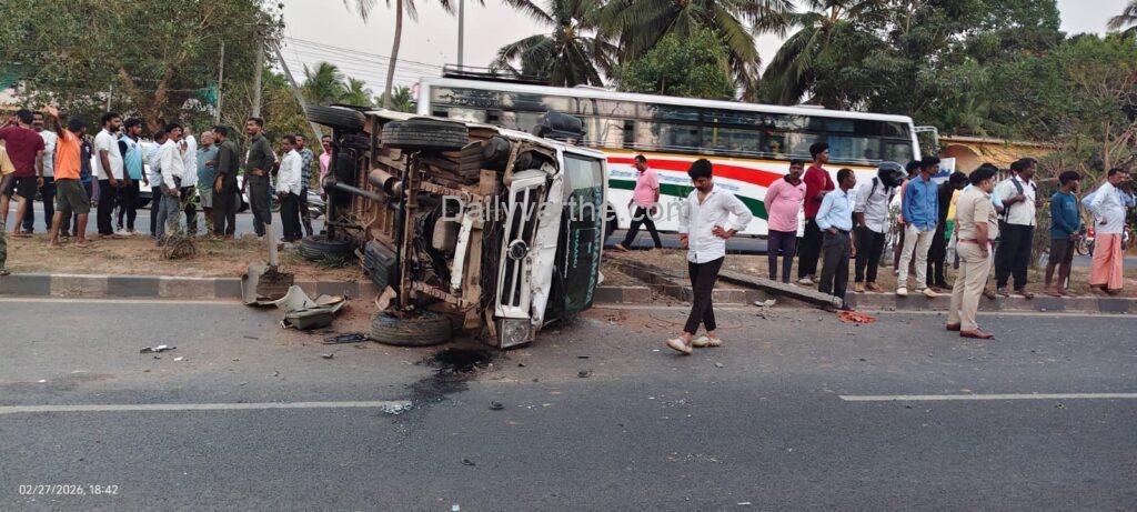 ಕುಂದಾಪುರದಿಂದ ಉಡುಪಿಯ ಶೋರೂಂಗೆ ದುರಸ್ತಿಗಾಗಿ ತೆರಳುತ್ತಿದ್ದ ಟೆಂಪೋ ಟ್ರಾವೆಲರ್, ಕೋಟ ಸಮೀಪಿಸುತ್ತಿದ್ದಂತೆ ಏಕಾಏಕಿ ಇಂಜಿನ್ ಕ್ರ್ಯಾಂಕ್ ಕಟ್ ಆದ ಪರಿಣಾಮ ಚಾಲಕನ ನಿಯಂತ್ರಣ ತಪ್ಪಿದೆ. ವೇಗವಾಗಿದ್ದ ವಾಹನವು ರಸ್ತೆಯ ಮಧ್ಯದ ಡಿವೈಡರ್ನಲ್ಲಿದ್ದ ವಿದ್ಯುತ್ ಕಂಬಕ್ಕೆ ಬಲವಾಗಿ ಡಿಕ್ಕಿ ಹೊಡೆದು, ಡಿವೈಡರ್ ಹಾರಿ ವಿರುದ್ಧ ದಿಕ್ಕಿನ ರಸ್ತೆಗೆ ನುಗ್ಗಿದೆ. ಈ ವೇಳೆ ಉಡುಪಿಯಿಂದ ಕುಂದಾಪುರ ಕಡೆಗೆ ಚಲಿಸುತ್ತಿದ್ದ ಕಾರಿಗೆ ಡಿಕ್ಕಿ ಹೊಡೆದ ಟಿಟಿ ವಾಹನ ರಸ್ತೆಯಲ್ಲೇ ಪಲ್ಟಿಯಾಗಿದೆ.