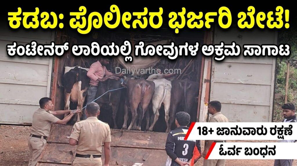 ಕಡಬ ಠಾಣಾ ವ್ಯಾಪ್ತಿಯ ನೂಜಿಬಾಳ್ತಿಲದ ಕನ್ವಾರೆ ಪ್ರದೇಶದಲ್ಲಿ ಕಂಟೇನರ್ ಲಾರಿಯೊಂದನ್ನು ಪೊಲೀಸರು ಅಡ್ಡಹಾಕಿ ಪರಿಶೀಲನೆ ನಡೆಸಿದರು. ಗೋವುಗಳನ್ನು ಅಕ್ರಮವಾಗಿ ಸಾಗಿಸುತ್ತಿರುವ ಬಗ್ಗೆ ಖಚಿತ ಮಾಹಿತಿ ದೊರೆತ ಹಿನ್ನೆಲೆ ದಾಳಿ ನಡೆಸಲಾಗಿತ್ತು.