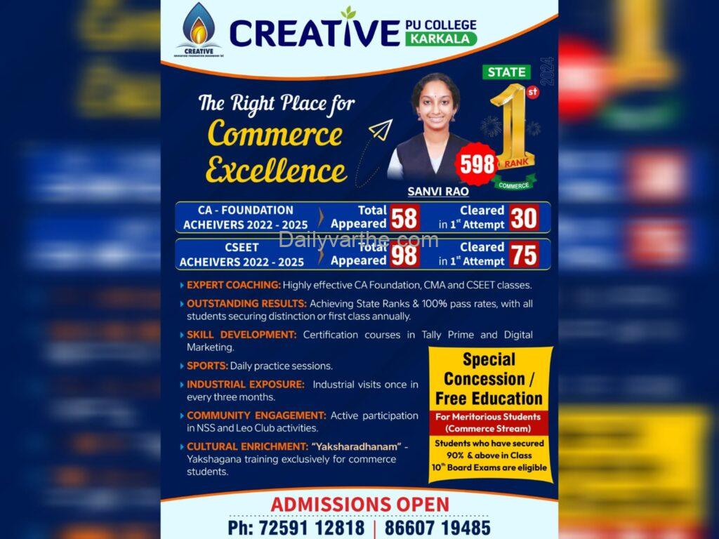 2026 -27ನೇ ಶೈಕ್ಷಣಿಕ ಸಾಲಿನ ಹತ್ತನೇ ತರಗತಿ ಪರೀಕ್ಷೆಯಲ್ಲಿ 90%ಕ್ಕಿಂತ ಅಧಿಕ ಅಂಕ ಗಳಿಸಿದ ಕಾರ್ಕಳದ ಸ್ಥಳೀಯ ವಿದ್ಯಾರ್ಥಿಗಳು ವಾಣಿಜ್ಯ ವಿಭಾಗವನ್ನು ಸೇರಬಯಸುವುದಾದರೆ ಕ್ರಿಯೇಟಿವ್ ಶಿಕ್ಷಣ ಸಂಸ್ಥೆಯ ಹೊಂಗಿರಣ ಯೋಜನೆಯಡಿಯಲ್ಲಿ ವಿಶೇಷ ರಿಯಾಯಿತಿಯನ್ನು ಪಡೆದುಕೊಳ್ಳಬಹುದಾಗಿದೆ. ಅತ್ಯಧಿಕ ಅಂಕ ಗಳಿಸಿದ ವಿದ್ಯಾರ್ಥಿಗಳಿಗೆ ವಾಣಿಜ್ಯ ವಿಭಾಗದಲ್ಲಿ ಉಚಿತ ಶಿಕ್ಷಣಕ್ಕೂ ಅವಕಾಶ ಕಲ್ಪಿಸಲಾಗಿದೆ. ವಾಣಿಜ್ಯ ವಿಭಾಗದಲ್ಲಿ ಸಾನ್ವಿರಾವ್ ಎಂಬ ವಿದ್ಯಾರ್ಥಿನಿ 598 ಅಂಕಗಳನ್ನು ಗಳಿಸುವುದರ ಮೂಲಕ ರಾಜ್ಯಕ್ಕೆ ಪ್ರಥಮ ಸ್ಥಾನಿಯಾಗಿ ಗುರುತಿಸಿಕೊಂಡಿರುವುದು ಕ್ರಿಯೇಟಿವ್ ಶಿಕ್ಷಣ ಸಂಸ್ಥೆಯ ಹೆಗ್ಗಳಿಕೆಯಾಗಿದೆ.