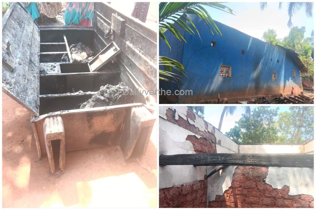 ಬೆಂಕಿಯ ಕೆನ್ನಾಲಿಗೆಗೆ ಮನೆಯ ಮಾಡು ಮತ್ತು ಗೋಡೆಗಳು ಕುಸಿದು ಬಿದ್ದಿವೆ. ಮನೆಯೊಳಗಿದ್ದ ಚಿನ್ನಾಭರಣ ಹಾಗೂ ನಗದು